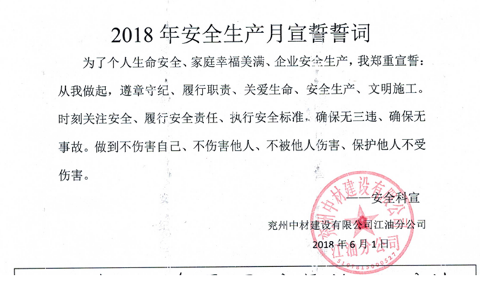 今年6月是全國第17個“安全生產(chǎn)月”, 6月1日,兗州中材江油分公司安全生產(chǎn)月活動啟動儀式在項目部會議室隆重召開,本次活動主題為“生命至上、安全發(fā)展”。項目部領導、員工共計40余人參加了本次安全生產(chǎn)月啟動儀式。 會上,安全科傳達《2018年安全生產(chǎn)月活動實施方案》并對安全工作進行闡述與部署。組織員工觀看安全教育宣傳片,通過對典型真實案例的生動再現(xiàn),使員工真正從思想深處懂得安全,重視安全,時時刻刻想著安全,增強職工安全意識,強化安全理念,提高職工的安全素質(zhì)。項目副經(jīng)理強調(diào),安全是社會經(jīng)濟發(fā)展的需要,是企業(yè)自身發(fā)展的需要,是從業(yè)人員參與勞動的需要。要樹立“紅線意識”,堅決落實崗位責任;加強安全教育宣傳,定期排查隱患,完善安全體制建設,依法治安、依法作業(yè);堅持“安全第一、預防為主、綜合治理”的方針,持續(xù)有效推動公司安全生產(chǎn)形勢穩(wěn)定發(fā)展。項目經(jīng)理要求,一是要加強領導、高度重視,正確把握當前安全形勢,突出落實安全責任主線,深刻認識開展“安全生產(chǎn)月”活動的重要意義;二是要圍繞主題、協(xié)調(diào)推進,大力宣傳黨和國家的安全生產(chǎn)方針政策、法律法規(guī),通過開展一系列安全活動,進一步營造“關愛生命、關注安全”的安全氛圍;三是要扎實開展、狠抓落實,以“安全生產(chǎn)月”活動為契機,在保持雙體系有效運行的同時做到統(tǒng)一思想、提高安全意識,為公司安全穩(wěn)定、和諧發(fā)展提供有力保障;四是要強化培訓、提升意識,圍繞國家法律法規(guī),開展員工安全教育培訓,全面提升全員綜合安全素質(zhì)及法制意識,強化依法治企、依規(guī)治企。會議最后,項目部組織全體員工進行安全月宣誓和簽名,安全生產(chǎn)月正式拉開帷幕。