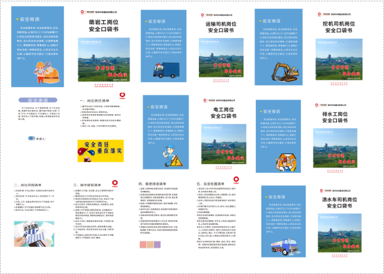 口袋書封面背頁以安全為主題,與生產(chǎn)相結(jié)合,內(nèi)容包括安全文化標(biāo)語、口號、個人安全承諾、具體崗位職責(zé)要求、風(fēng)險辨識、操作規(guī)范、隱患排查、應(yīng)急處置等。